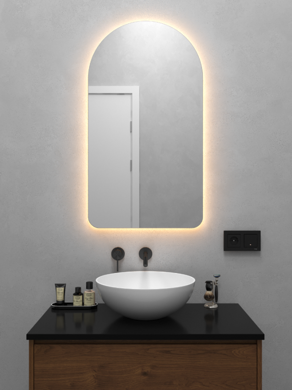 Безрамное зеркало арочной формы с контурной (тыльной) тёплой подсветкой, свет 3000К. Подложка из высококачественного МДФ, светодиодная лента защищена матовым свето-рассеивателем от попадания пыли и влаги. Есть вывод 220W для подключения к сети, включение подсветки от выключателя на стене, либо от розетки.